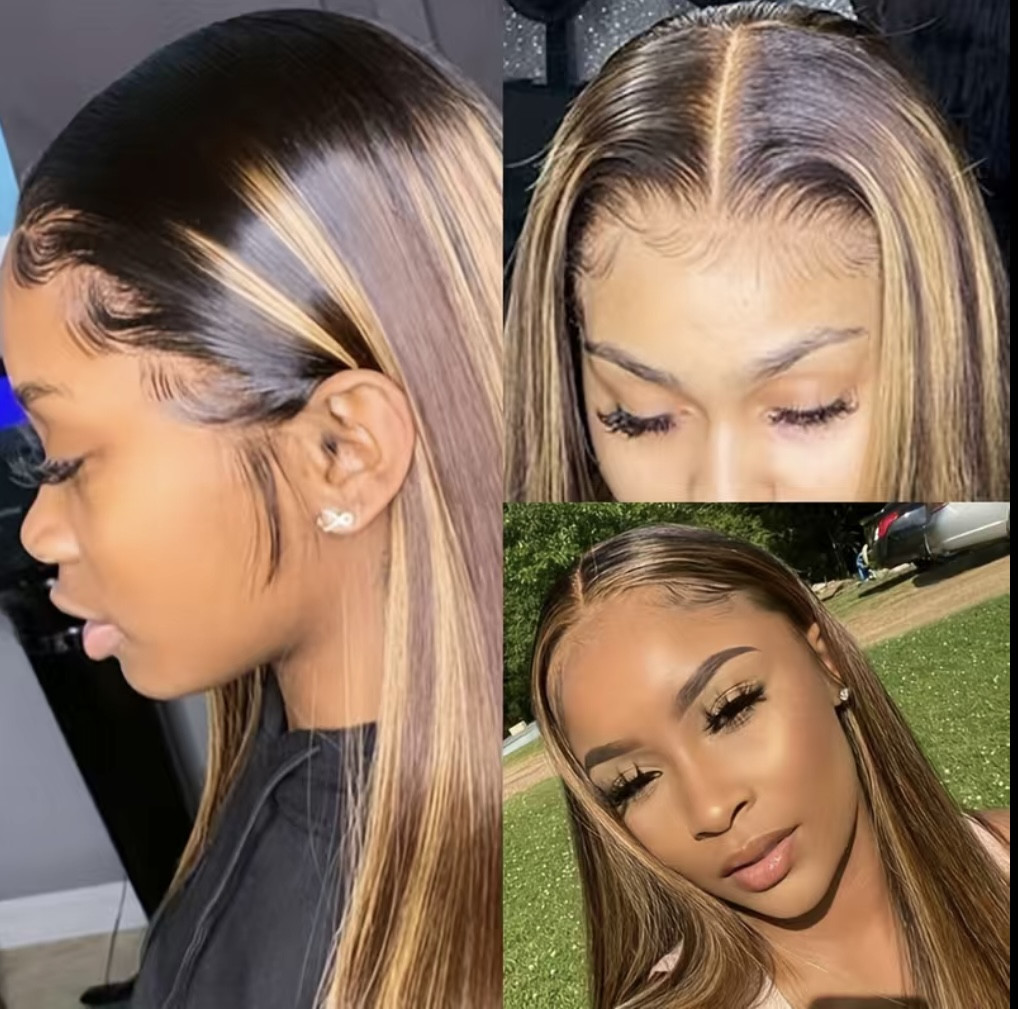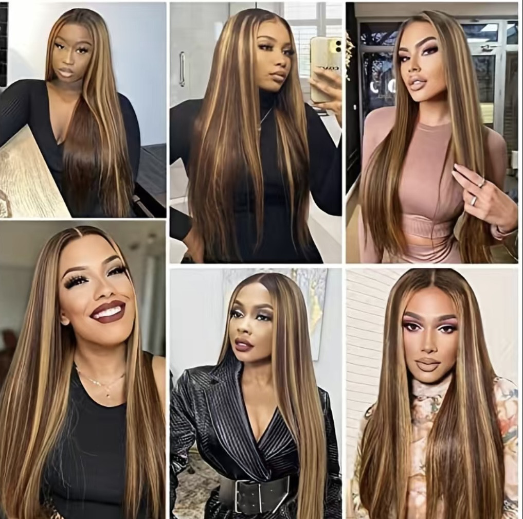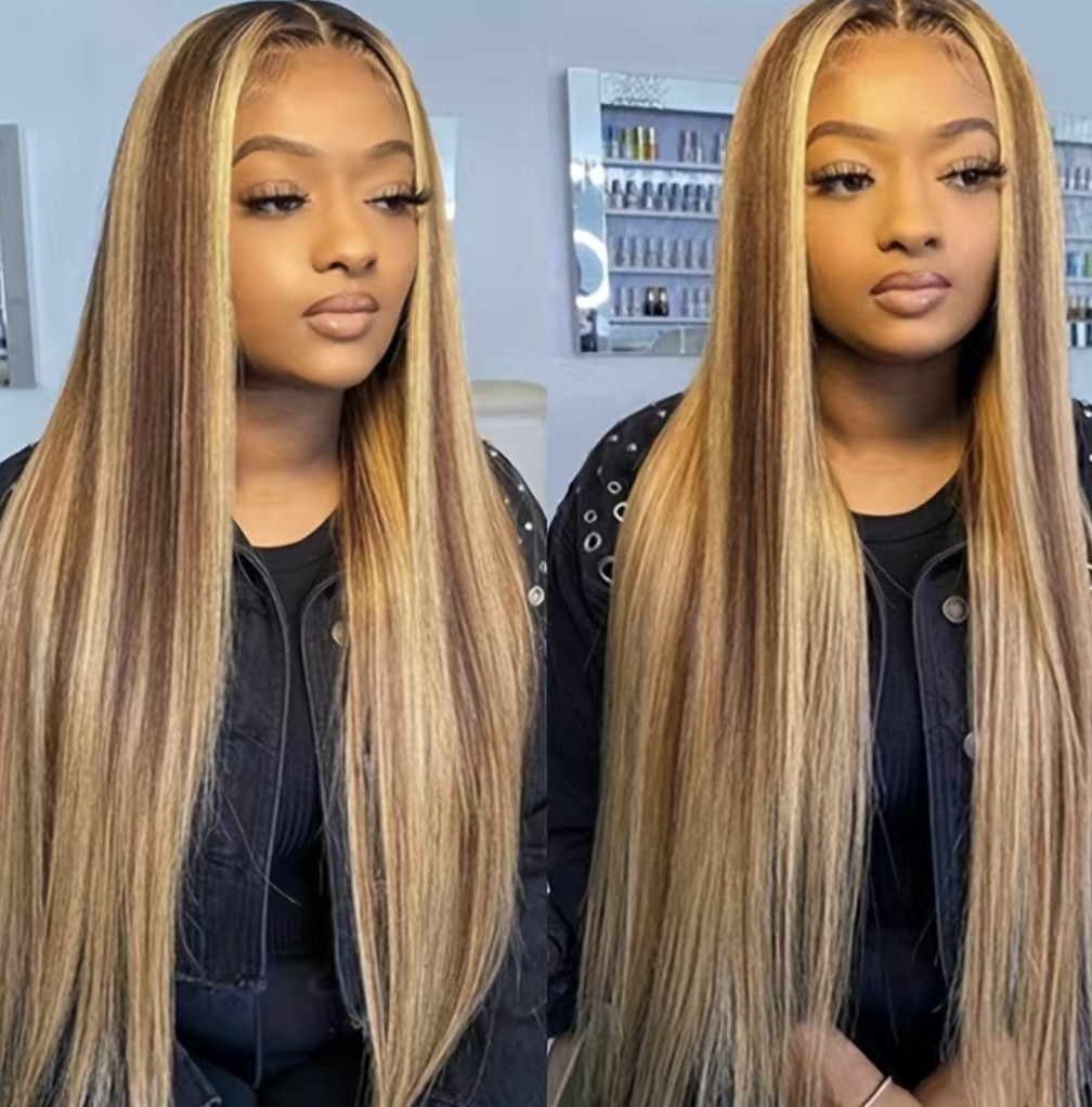 Perruque Lace Front Wig naturelle lisse et longue, cheveux ombré miel, 4x4x1, 14 à 30 pouces, couleur à reflets, densité 180%, pour femmes longueur 24