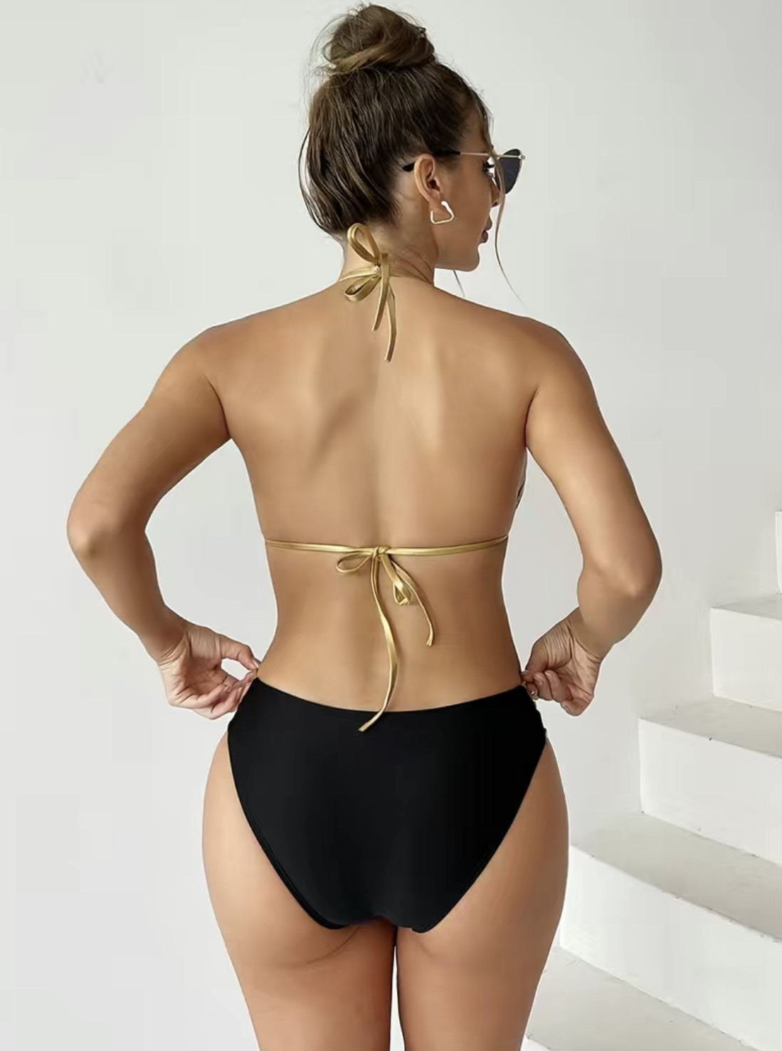 Ensemble bikini 2 pièces à bretelles ajourées avec bordure dorée, maillot de bain noir très extensible avec col licou et dos nu, maillots de bain et vêtements pour femmes